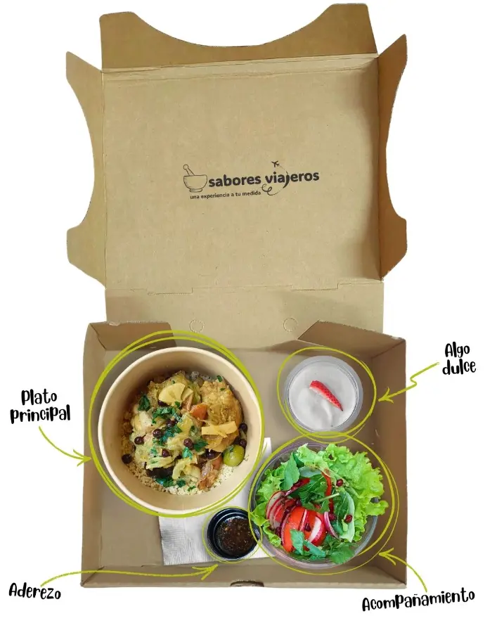 - Todo llega organizado en cajas con porciones individuales y cubiertos descartables, fácil de manejar y compartir.