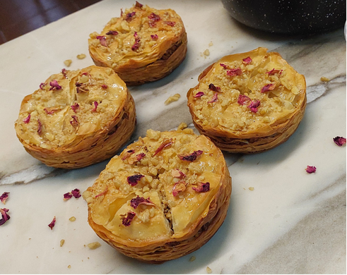 Amamos el baklava, y se nota en cada capa. El nuestro está hecho con un hojaldre finísimo, casi transparente, generosamente pincelado con manteca y apilado en docenas de capas doradas y crocantes. En su interior vas a encontrar una mezcla dulce y aromática de pistachos o nueces con especias, que le da a cada bocado su crocante característico y ese perfume tan tentador.