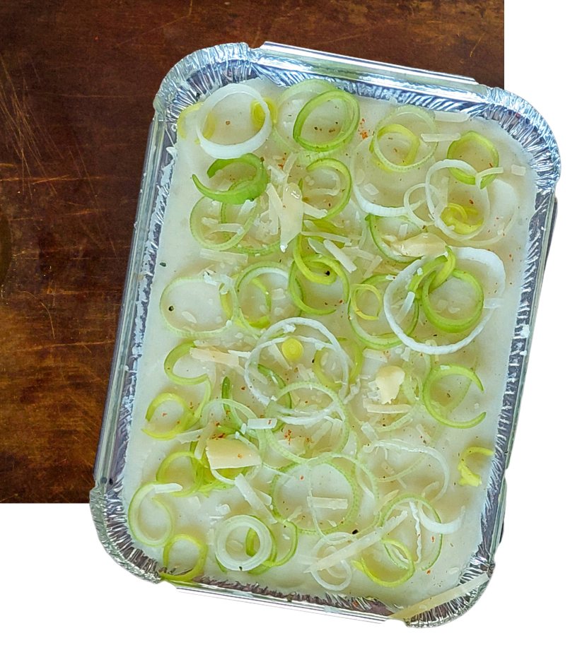 Nuestra reinterpretación vegetariana del clásico: lentejas tiernas y hongos secos cocidos con cebolla, zanahoria, apio y condimentos, cubiertos con un puré de papas cremoso y dorado. Arriba, un toque especial: puerros finamente cortados con unos trocitos de manteca y un toque de paprika dulce, que se gratinan al final y le aportan sabor y textura.