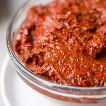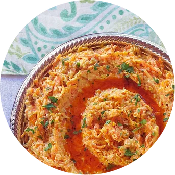 Un dip turco vibrante de zanahorias ralladas salteadas, yogur natural bien cremoso, ajo y nueces. Está sazonado con hierbas frescas y decorado con un aro de aceite de ají de Alepo, que realza su sabor suave y refrescante con un toque especiado y colorido.