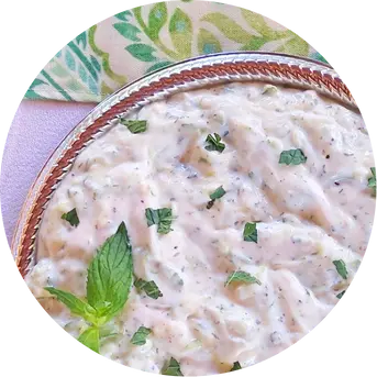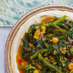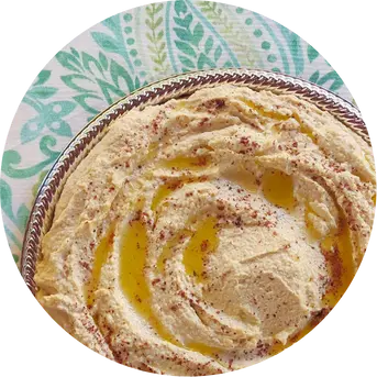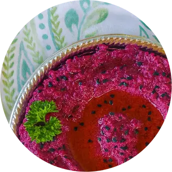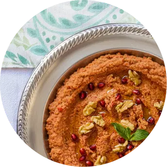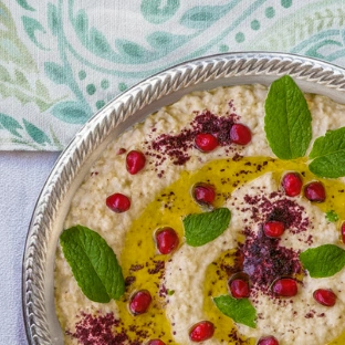 Un dip tradicional del Levante hecho con berenjena asada, tahini, ajo y limón. A diferencia del baba ganoush, no lleva tomate ni cebolla y se caracteriza por una textura suave y cremosa. Se decora con semillas de granada, menta fresca y un toque de sumac.